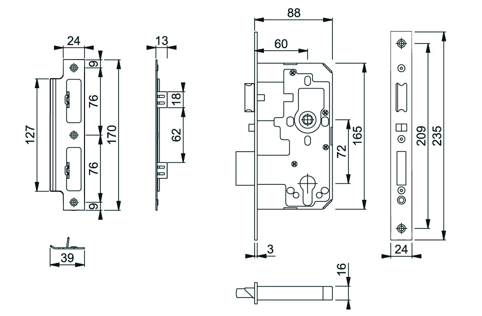 The lockcase has room for a key cylinder, allowing both key deadlocking and key override. A key cylinder is not supplied and must be bought separately for this action. Suitable for internal and sheltered external use on wooden, composite and steel doors.